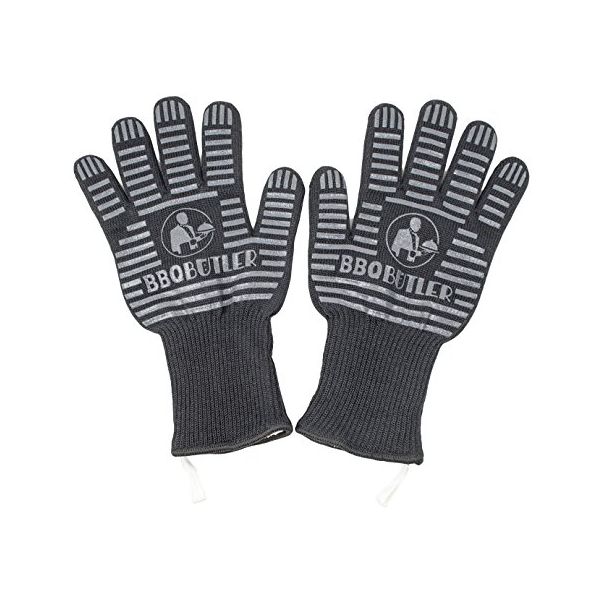 Heat Resistant BBQ Gloves. One size fits most - no-slip thick fabric gloves made up of 80% meta-aramid / 20% para-aramid / 100% thick cotton lining. Heat resistant rated at 662° F with an extremely fine knit & high thread, these gloves can handle any heat with barbecues, grills, ovens, microwaves, dutch ovens, pots & pans, campfires, light bulbs and much more! Easily grip all your items with the ultimate no-slip silicone strips! The cotton lined interior and glove flexibility provide great comfort and extends high up the wrists for extra protection!