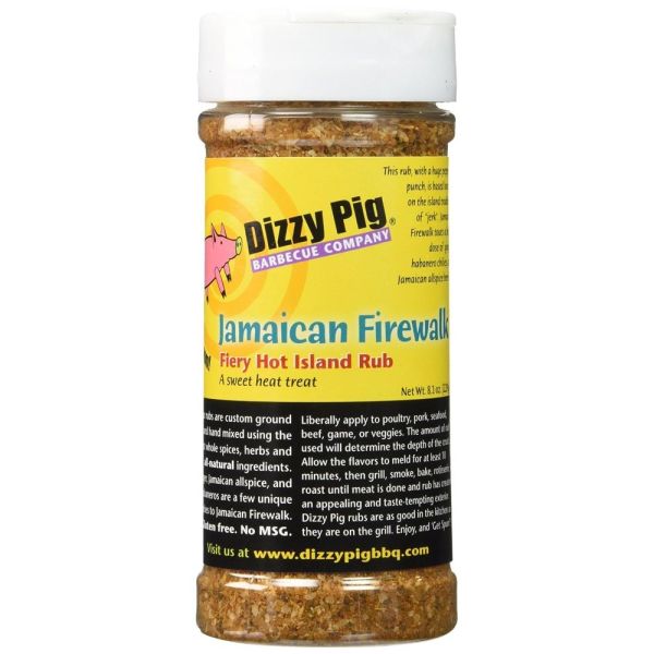 Jamaican Firewalk Fiery Hot Island Rub from Dizzy Pig Barbecue Company gives you a sweet heat treat! This rub, with a huge peppery punch, is based loosely on the island tradition of "jerk".  Jamaican Firewalk touts a heft dose of ginger, habanero chilies, and Jamaican allspice berries and is rounded out with a citrussy tang.  Best on meats that are normally jerked - chicken, shrimp, pork tenderloin, pork ribs, pork chops, steaks, fish and veggies are all good candidates! Dizzy Pig's rubs are custom ground and hand mixed using the freshest whole spices, herb and all-natural ingredients.  Gluten free.  No MSG.  Net Wt. 8.1 oz.
