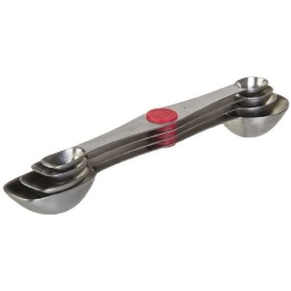 These Stainless Steel Measuring Spoons magnetically nest while stored and feature distinctive dual ends. The rounded ends measure liquids while the opposite ends feature straight edges for scooping and leveling off dry ingredients. These stainless steel spoons are long enough to reach into tall bags and spice jars.